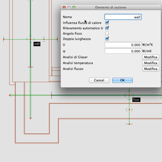 Si possono definire due lunghezze per ogni elemento di sezione. Il programma calcolerà contemporaneamente il PSI per la misura corta e per quella lunga, fornendo nei risultati sia il PSI interno che il PSI Esterno di un ponte termico.