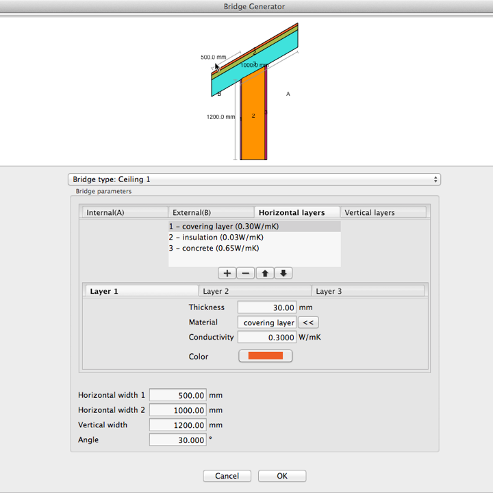 Con il plugin Bridge Generator puoi creare progetti di ponti termici senza l’uso del CAD. Puoi aggiungere strati, assegnare materiali e impostare le condizioni al contorno con pochi click. Una volta creato, il ponte termico è pronto per la simulazione oppure può essere ulteriormente personalizzato con gli strumenti di disegno.