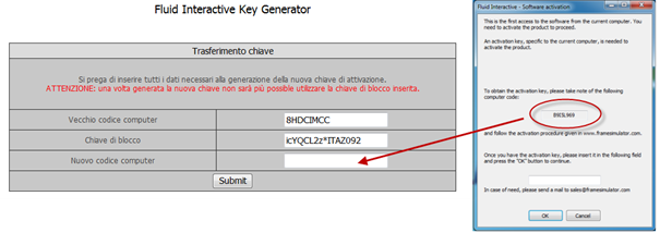 - Cliccando sul link per ottenere una nuova chiave di attivazione sarai collegato al sito Fluid Interactive, dove comparirà una maschera con i dati del vecchio computer (computer A). Inserisci qui il Nuovo Codice Computer (computer B – vedi punto 1):