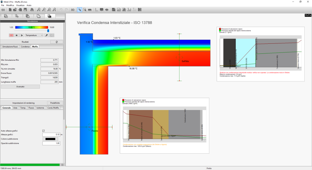Con la stessa simulazione, oltre alla verifica della muffa, Mold Simulator effettua anche la verifica di Glaser per la condensazione interstiziale, come previsto dalla ISO 13788.