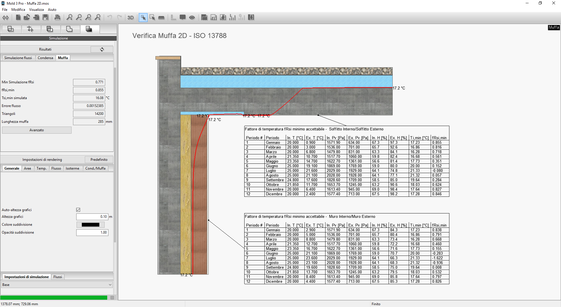 Molti pensano che basti verificare la temperatura superficiale nel mese più freddo, ma sbagliano. La verifica va fatta nel mese con il fattore di temperatura minimo accettabile più alto, tra quelli dei 12 mesi dell’anno. Mold PRO calcola tutti i valori di fRsi minimo accettabile per tutti i 12 mesi, per ogni coppia di contorno e poi mostra la formazione di muffa sulla superficie nella situazione peggiore.