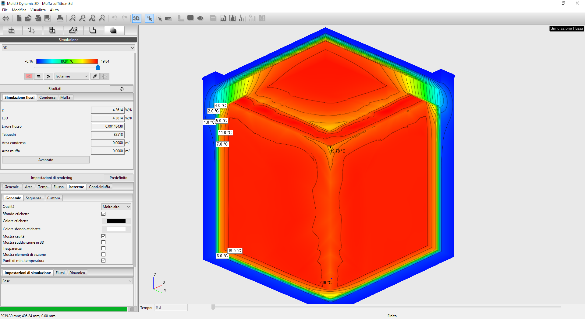 Mold Dynamic effettua delle simulazioni agli elementi finiti in istanti successivi, tenendo conto delle curve di temperatura e umidità caricate, del calore specifico e della massa volumetrica dei materiali. E’ quindi possibile conoscere la reale temperatura in ogni punto della sezione in ogni istante.