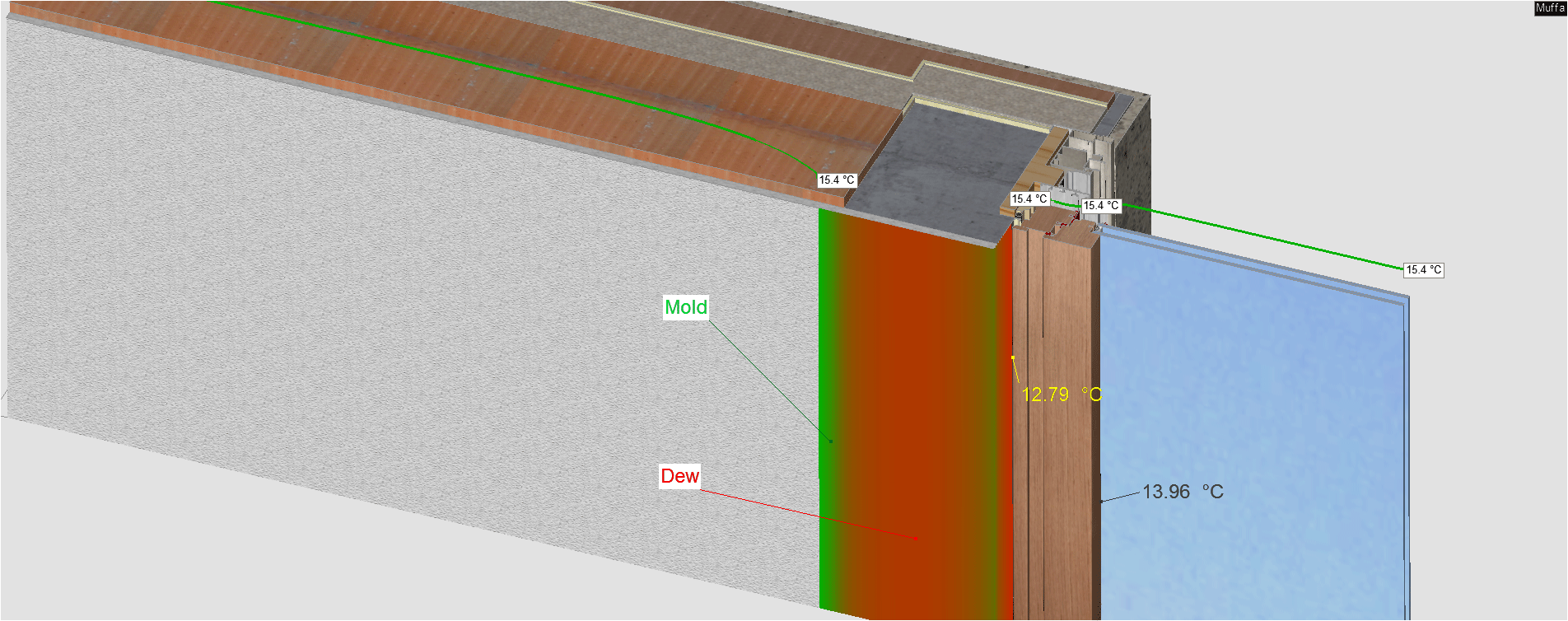 In addition to calculating thermal flows, the program automatically performs two other simulations with the parameters of ISO 13788: one for checking the risk of condensation and one for assessing mold formation.