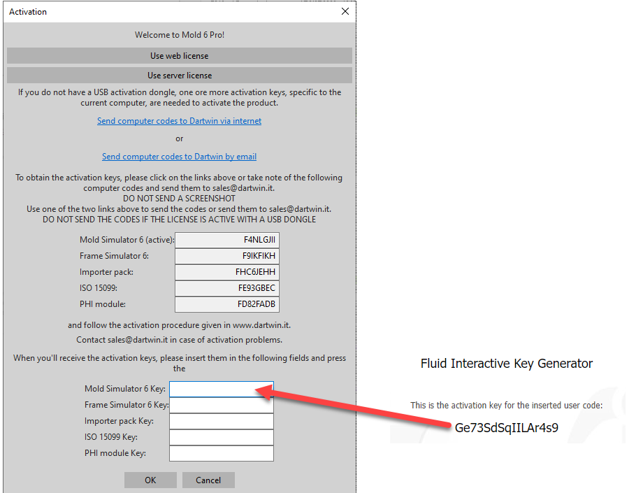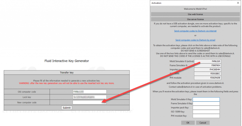 - By clicking on the link to obtain a new activation key you will be connected to the Fluid Interactive website, where a mask with the data of the old computer (computer A) will appear. Enter the New Computer Code here (computer B – see point 1):